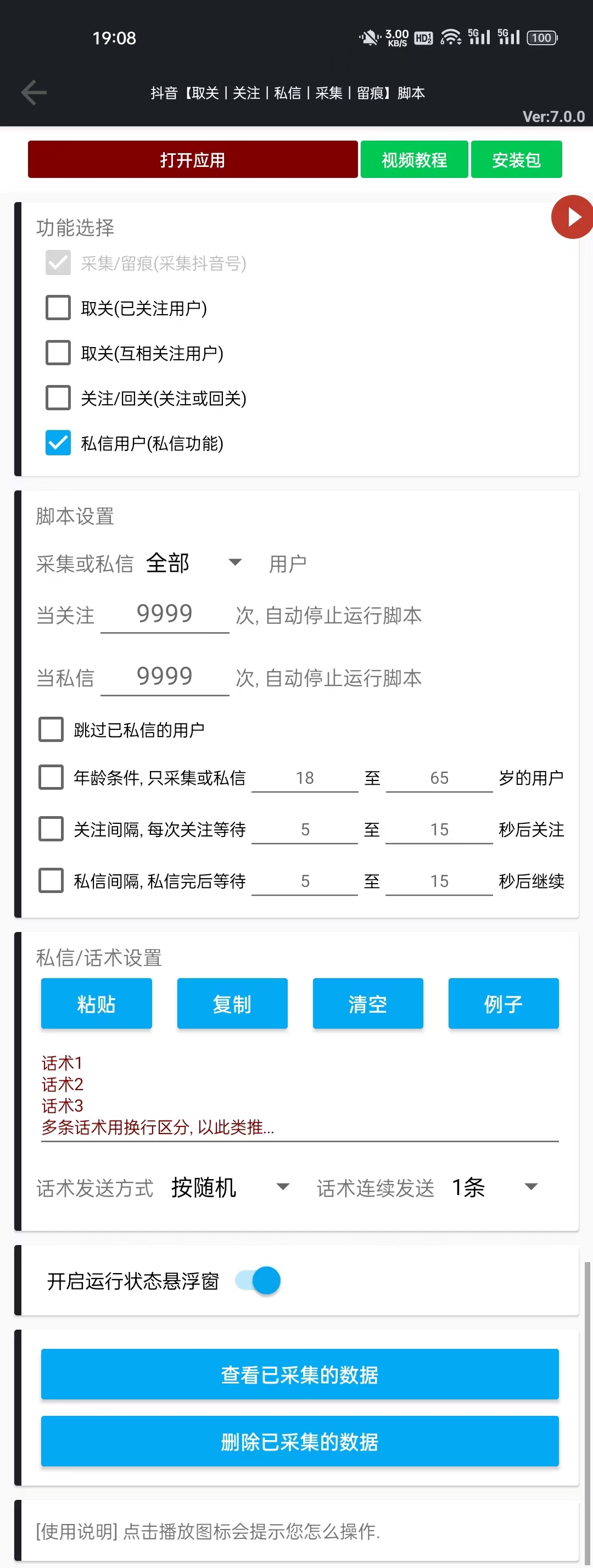 - 脚本就是通过安装手机APP应用,在相应的应用里给里面的人发广告,通过发消息,将人到我们的微信或QQ当中。 现在QQ或微信加人限制越来越大,封号几率成倍增加。现在通过脚本,来实现被动加人,就降低了封号风险。 脚本设置非常简单,利用平台APP内的私信和关注等功能自动化操作,发消息给APP内的用户,通过话术到自己的QQ或微信里,实现了被动加人。 有人问,用脚本一天能加到多少人?我只能说你干的多,就的多。举个例子,开一个模拟器运行一天脚本如引到50+人,那么多开模拟器去操作,就可以相当可观的人数。